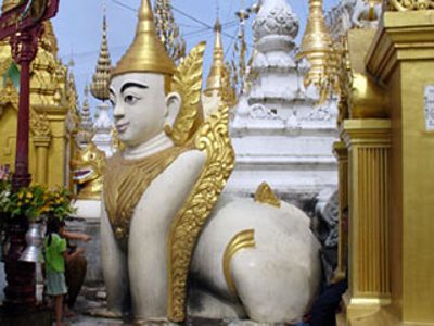 The man-lion mythical creature best known in Myanmar is the manussiha, its name is a blend of two Pali words, the first manussa, meaning a human being, and the second siha, a lion. It can be found at each of the four corners of some stupas, a human head and torso on top of the forked haunches of a lion into which the corner of a block like the plinth of a stupa. dovetails snugly. The human head of the modern manussiha can be seen wearing a crown finished with a motif of tier upon tier of upright lanceolate neem leaves tapering off to a pointed finial and ornamented earflaps, the face with regular features composed in a benign if somewhat wooden attitude. Thus it may be called a sphinx, after a fashion, as the classical Grecian sphinx should be considered female, since it is depicted with a woman’s head and bust on a winged lion while the manussiha is male.
